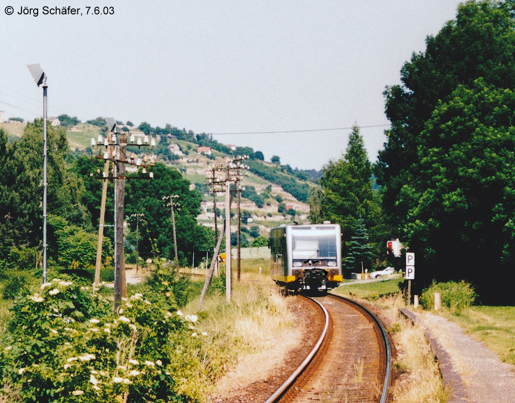 Als RB nach Naumburg (S) Hbf verlässt dieser KEG VT 3.xx am 07.06.2003 den Haltepunkt in Balgstädt. (Foto: Jörg Schäfer)