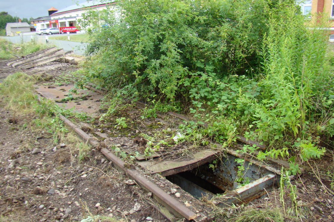 Am 14.07.2021 wurde leider das noch vorhandene ehem. Ladegleis im Bahnhof Laucha durch einen Zweiwegebagger entfernt. Damit sind leider in Zukunft dort keine Draisinenfahrten mehr möglich. (Foto: Günther Göbel)