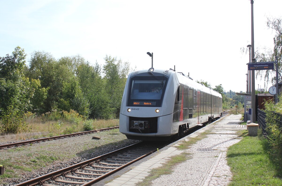 Abellio 1648 422 als RB 80556 von Naumburg (S) Ost nach Nebra, am 19.09.2024 auf der Unstrutbahn bei Zingst. Nach Wangen (U) geht es ab Nebra mit dem Schienenersatzverkehr weiter.