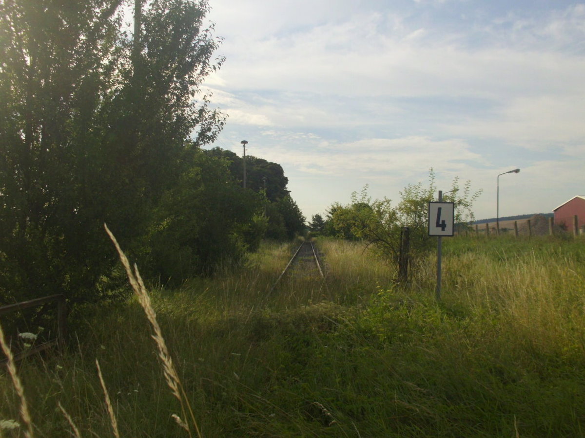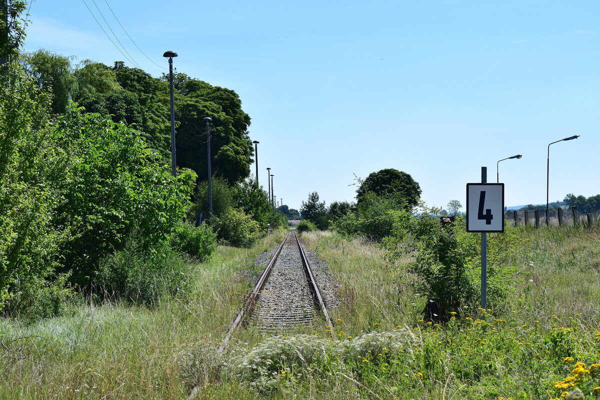 40 km/h sind erlaubt, gefahren ist hier jedoch schon seit einigen Jahren ein Zug mehr. Blick auf den ehemaligen Kreuzungsbahnhof Gehofen am 30.07.2020 vom Bahnübergang Bahnhofstraße aus. (Foto: Dennis Fiedler)