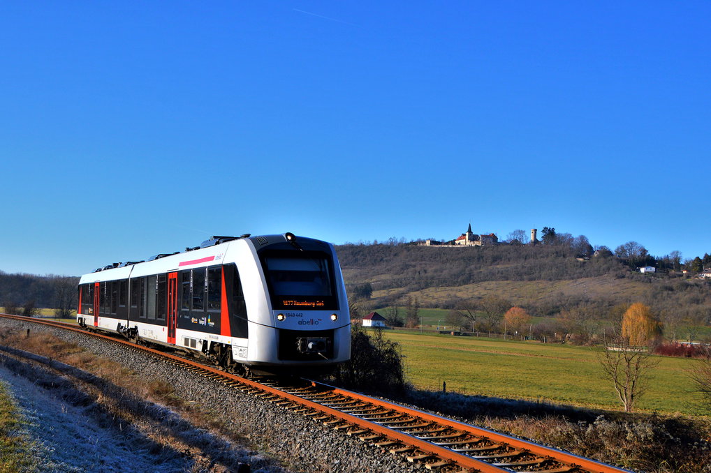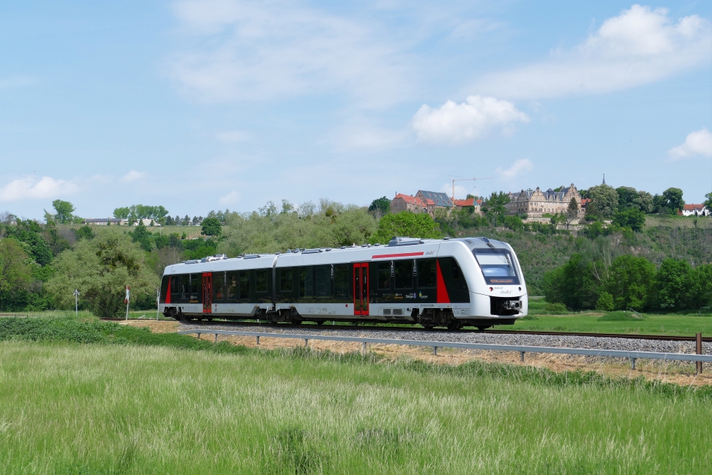Abellio Rail Mitteldeutschland auf der Unstrutbahn. 1648 937 als RB 80557 von Wangen (U) nach Naumburg (S) Ost, am 18.05.2022 in Zingst, unterhalb vom Schloß Vitzenburg. Thomas Fritzsche