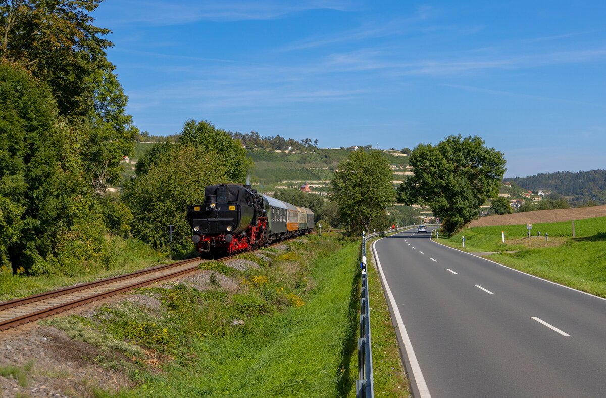 EMBB 52 8154 am 09.09.2023 beim umsetzen in Karsdorf. Im Hintergrund die Unstruttalbrücke und das Stellwerk W4.
