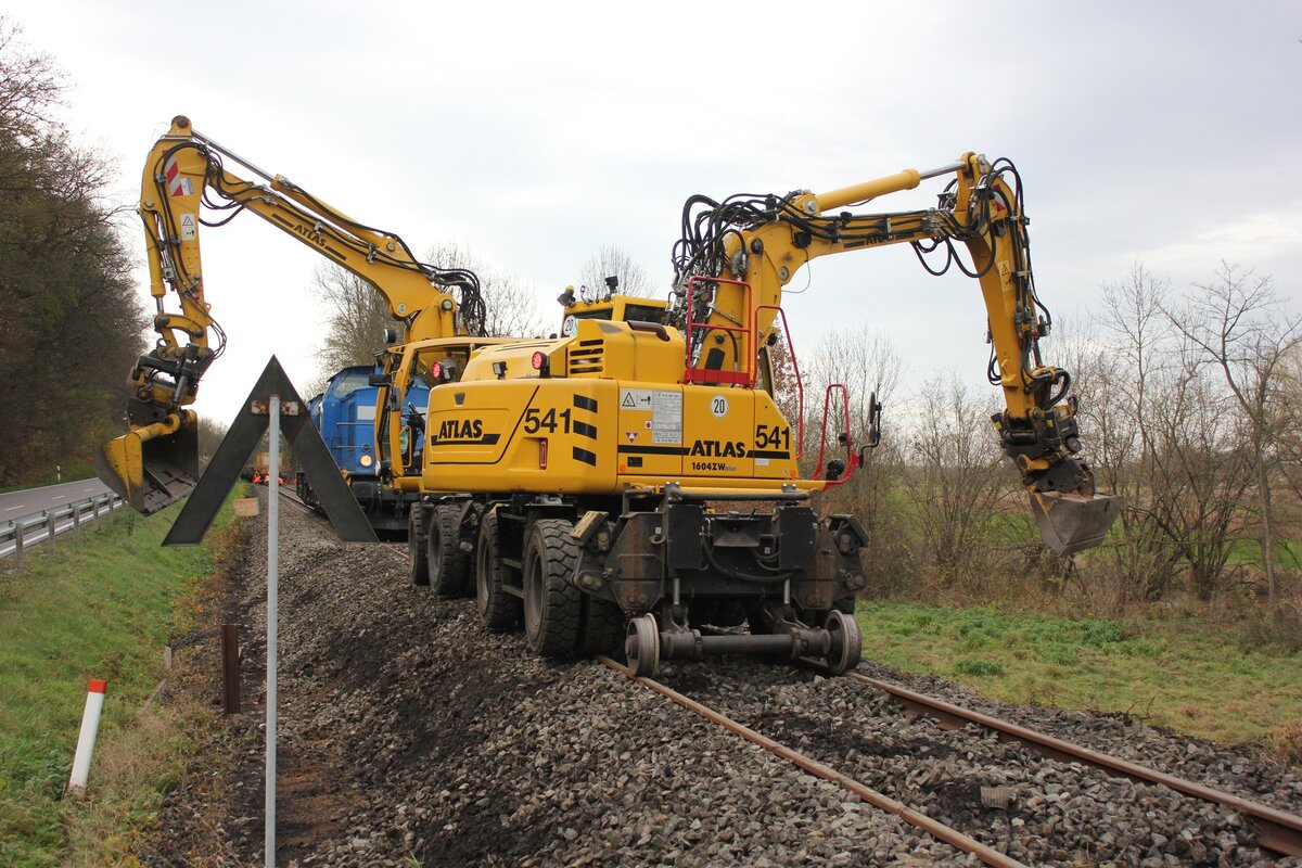 Ein Zweiwegebagger der Strabag am Hp Kleinjena. Dort wurde bereits damit begonnen, die alte Bahnsteigkante zuentfernen; 12.10.2011 (Foto: Klaus Pollmächer)