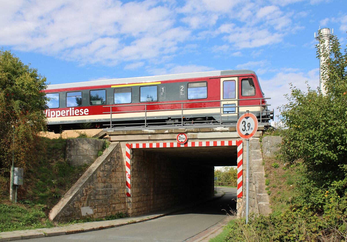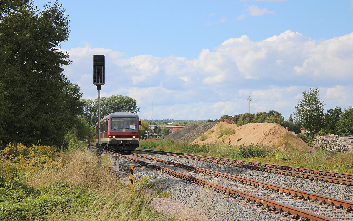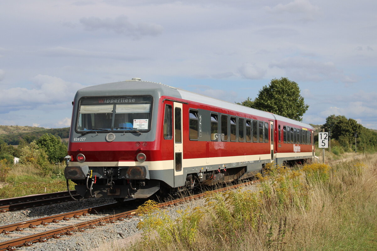 DB 628 503-5 verlässt am 24.04.2006 als RB Richtung Nebra den Hp Kleinjena. Im Zugzielanzeiger steht kurioserweise "Schloss Holte".