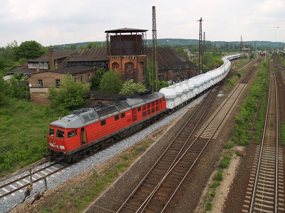 Am 16.07.2007 brachte die an InfraLeuna vermietete ALSTOM 202 001-4 leere Zementwagen nach Karsdorf. Klaus Pollmächer fotografierte den Zug vor der ehemaligen Zuckerfabrik in Laucha.