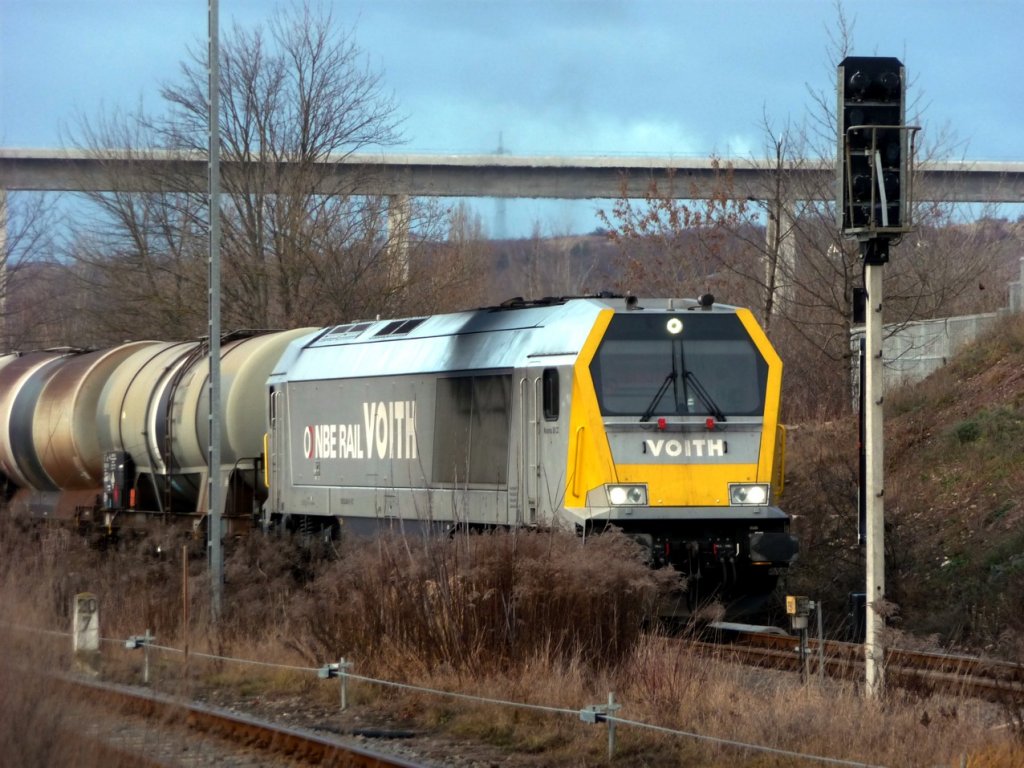 Voith L06-30006 (92 80 1263 006-9 D-VTLT), an Infra Leuna vermietet, mit leeren Kesselwagen von Karsdorf auf der Fahrt nach Leuna, am 27.12.2012 zwischen Kirchscheidungen und Laucha. (Foto: Klaus Pollmächer)