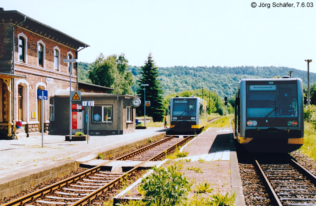 Im Jahr 2003 fanden alle 2 Stunden Kreuzungen der RB nach Artern und Naumburg Hbf im Bf Nebra statt. Hier zwei VT´s der KEG am 07.06.2003 beim 10 minütigen Aufenthalt. (Foto: Jörg Schäfer) Frank Thomas