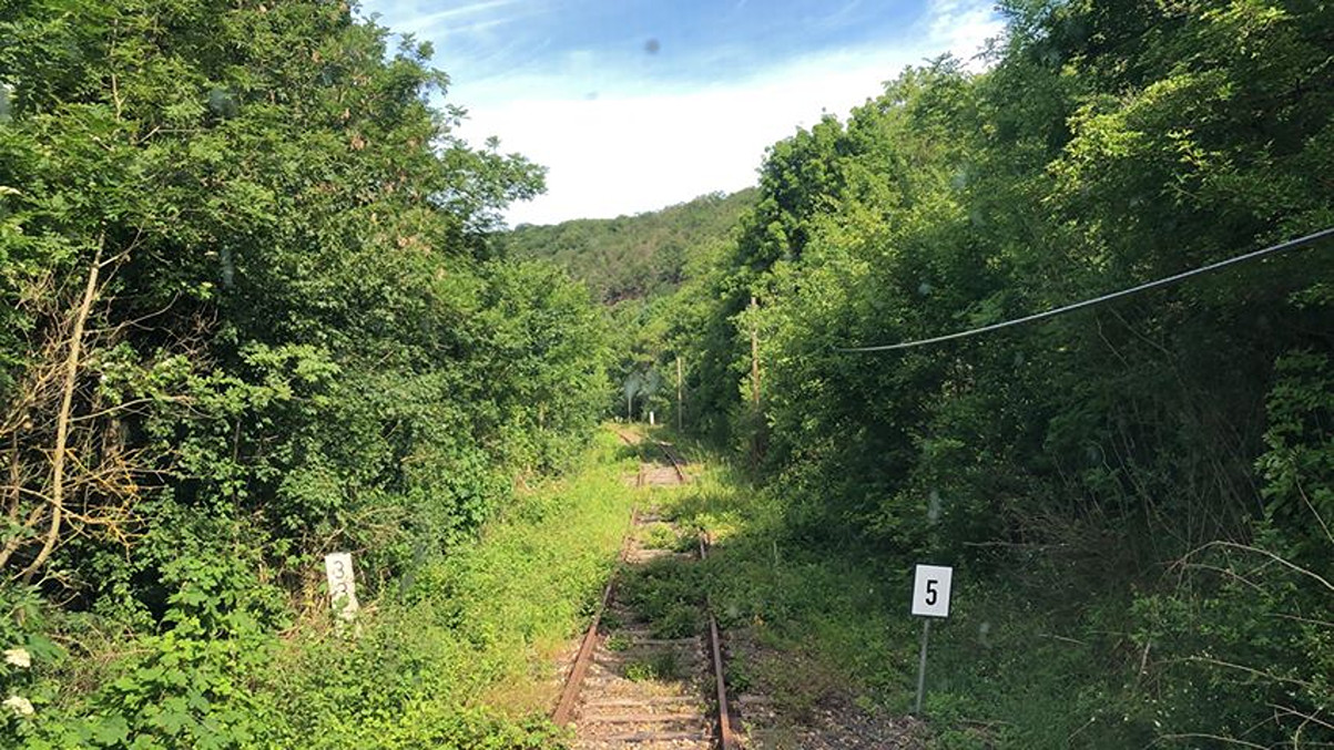 Das überwucherte Unstrutbahngleis am 10.07.2024 am Bahnübergang Kupferhüttenweg in Donndorf, mit Blick in Richtung Nebra. (Foto: Quentin Goerler)