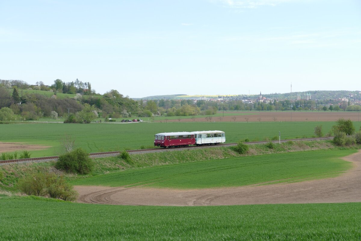Das EBS "Ferkeltaxi" 772 345-4 war am 16.08.2024 auf der Unstrutbahn bei Balgstädt von Karsdorf unterwegs nach Erfurt. Am Tag darauf fand von dort aus eine Sonderfahrt zum 150. Geburtstag der Pfefferminzbahn nach Sömmerda statt. (Foto: Wolfgang Krolop)