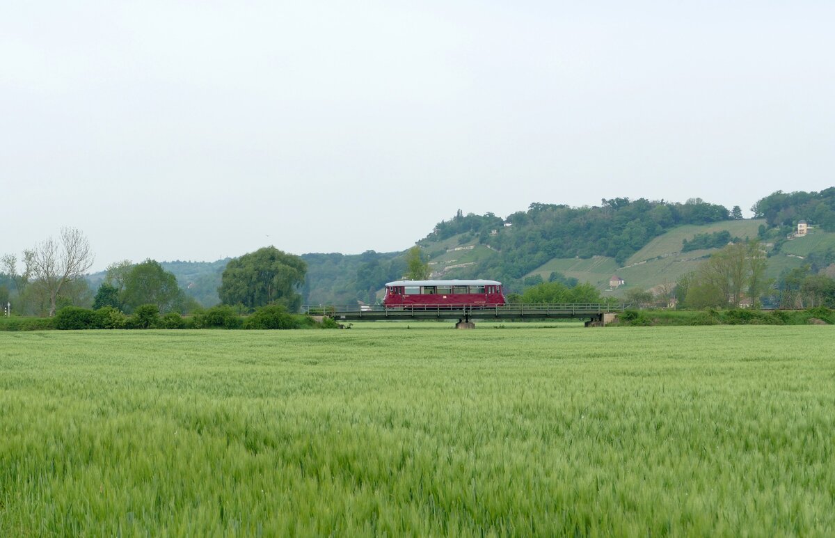 Das EBS  Ferkeltaxi  772 345-4 war am 16.08.2024 auf der Unstrutbahn bei Balgstädt von Karsdorf unterwegs nach Erfurt. Am Tag darauf fand von dort aus eine Sonderfahrt zum 150. Geburtstag der Pfefferminzbahn nach Sömmerda statt. (Foto: Wolfgang Krolop)