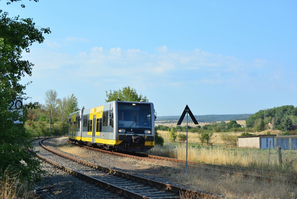 Burgenlandbahn 672 xxx als RB 26880 von Naumburg (S) Ost nach Wangen, am 25.08.2018 in Roßbach (Naumburg). (Foto: Wolfgang Krolop)
