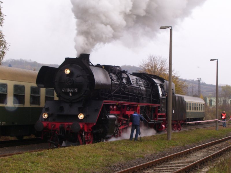 Das graue und nasse Herbstwetter umhüllt die 41 1144-9 der IGE  Werrabahn Eisenach  e.V. bei den Führerstandsmitfahrten im Bf Karsdorf; 21.10.2007