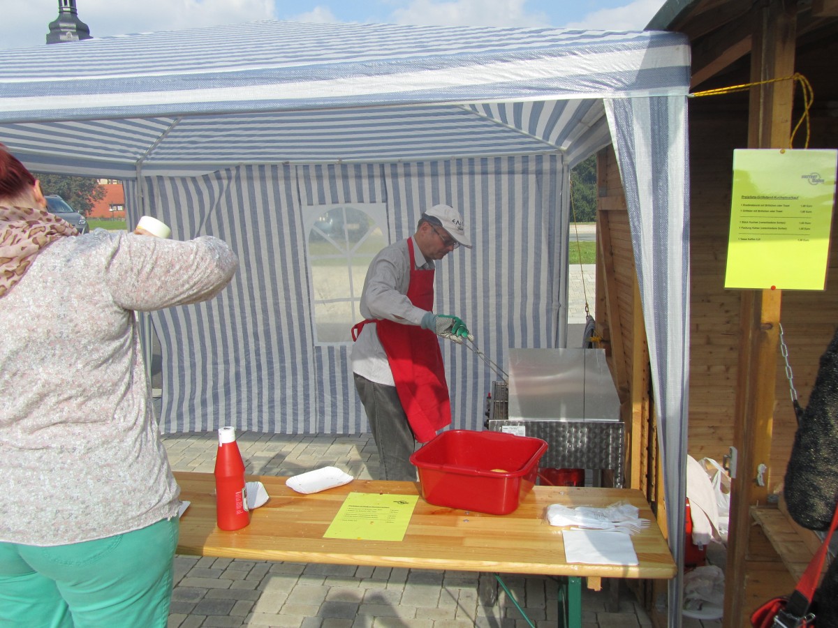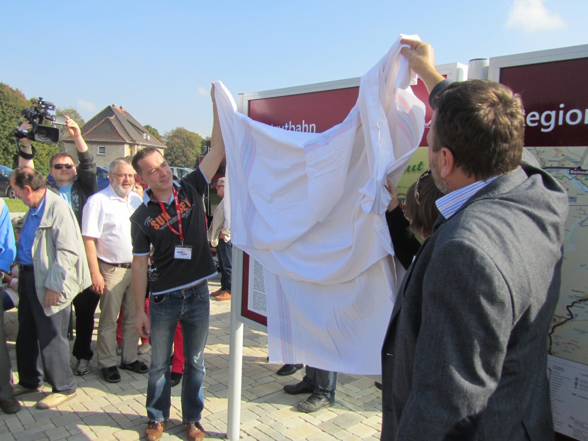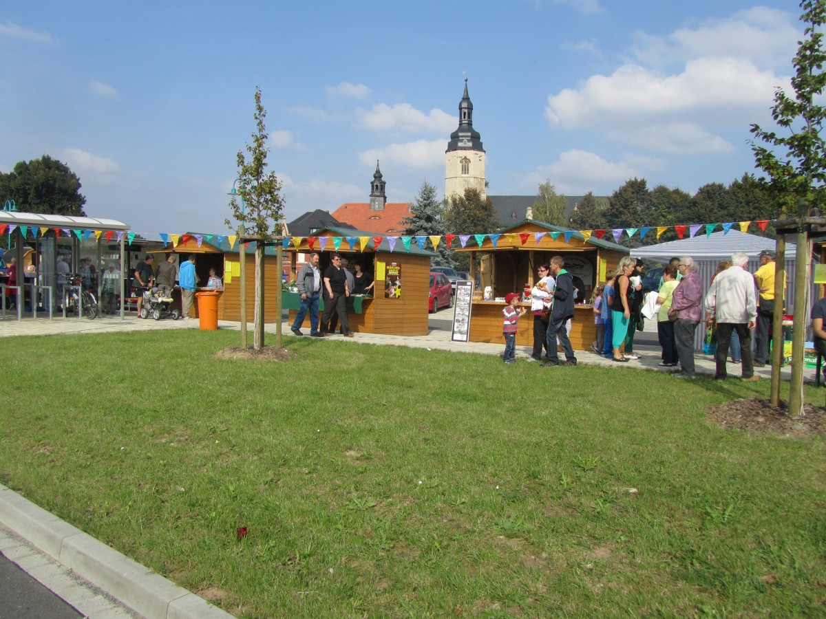 Zum 9. Unstrutbahnfest am 05.10.2014 in Laucha gab es an der alten Laderampe eine Kindereisenbahn, ein Trampolin und einen Zuckerwattestand zu entdecken. Entlang der Parkplätze an der Bushaltestelle gab es verschiedene Infostände. So gab es eine kleine Modellbahn zu bestaunen, der MDV war mit einem Infomobil dabei, die Straßenbahnfreunde aus Naumburg waren da, die Verbandsgemeinde "An der Finne" hatte einen Infostand und alte Autos und Traktoren waren ausgestellt. Selbstverständlich gab es auch Essen- und Getränkestände. Ein besonderes Schmankerl waren die selbstgebackenen Plätzchen in Form einer Dampflok und eines Andreaskreuzes. (Foto: Dieter Weber)