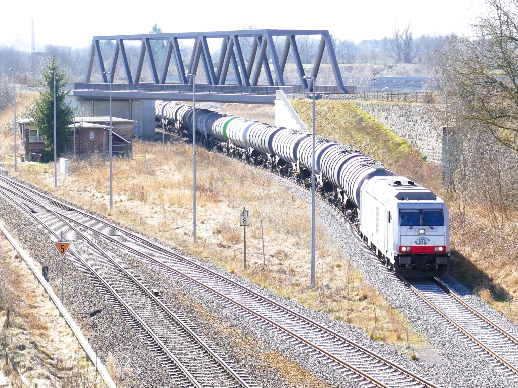 Das Überbauwerk der Strecke von Zeitz nach Weißenfels am 11.03.2022 in Zangenberg. Darunter ist die ITL 285 109 mit einem Kesselwagenzug von Zeitz Gbf in Richtung Leipzig zu sehen.