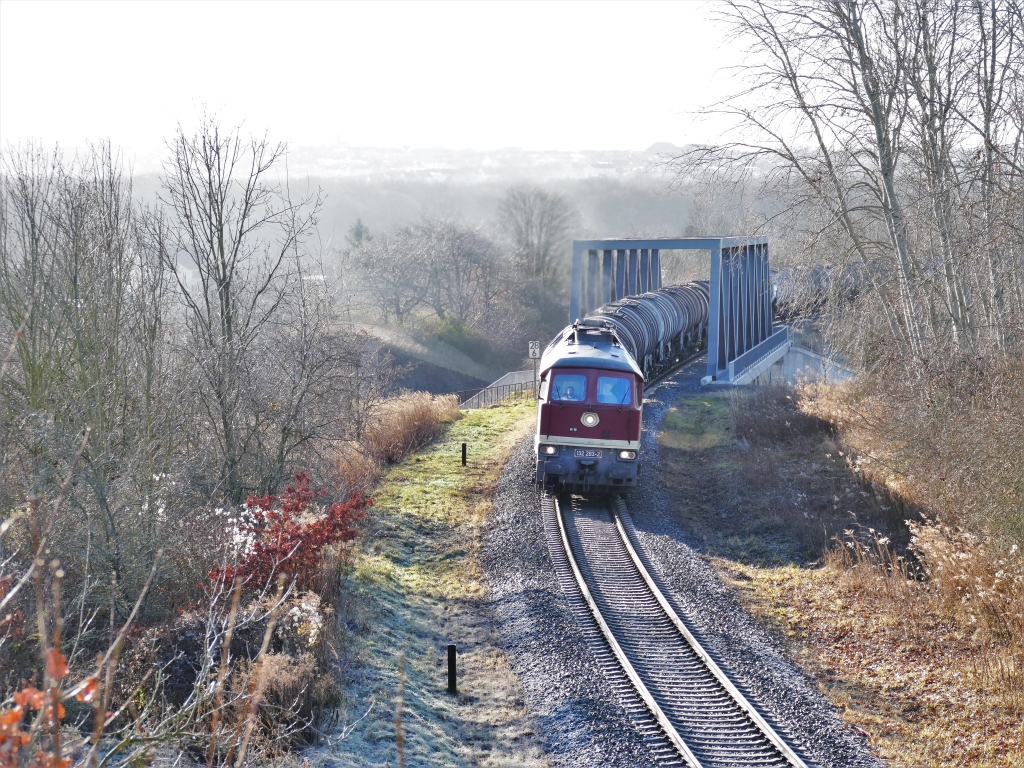 EBS 232 293 passiert am 20.12.2021 mit einem Kesselwagenzug von Zeitz nach Stendell  das Überbauwerk in Zangenberg.