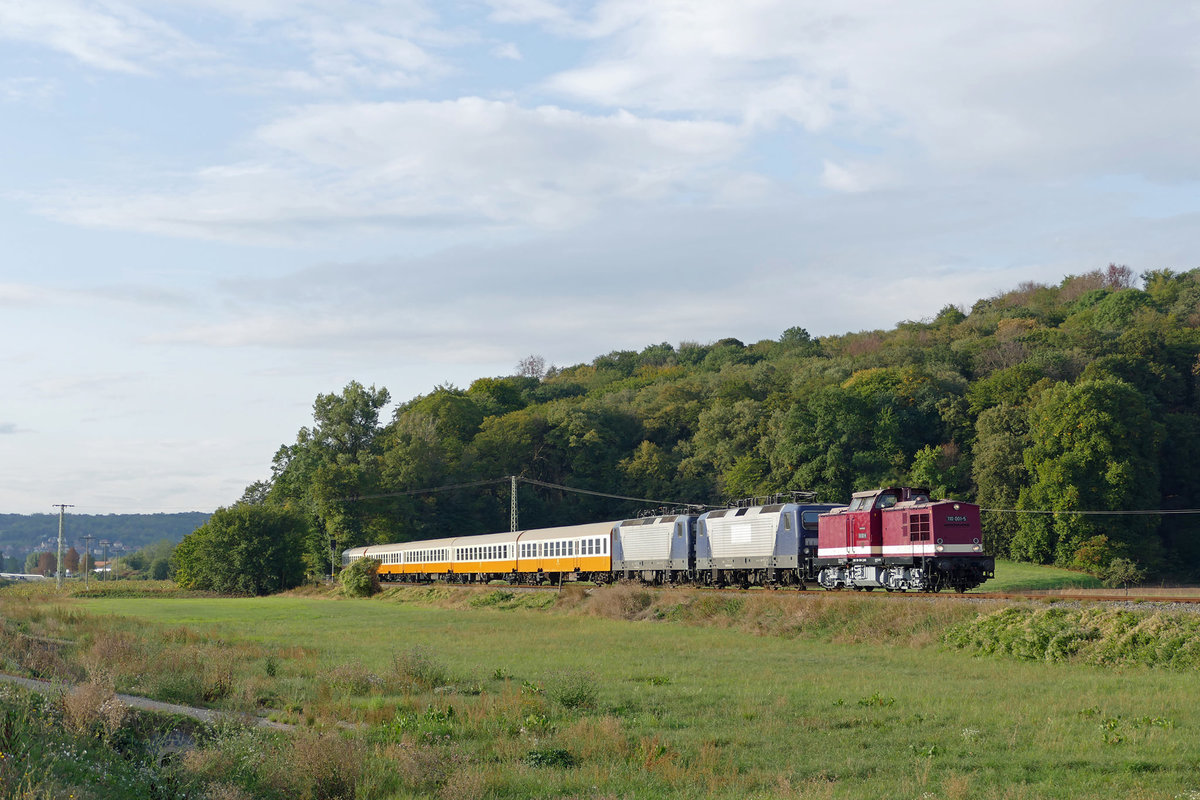 EBS 110 001 mit zwei 143er und Städteexpresswagen auf Überführungsfahrt nach Karsdorf, am 24.09.2020 bei Kleinjena. (Foto: Wolfgang Krolop)