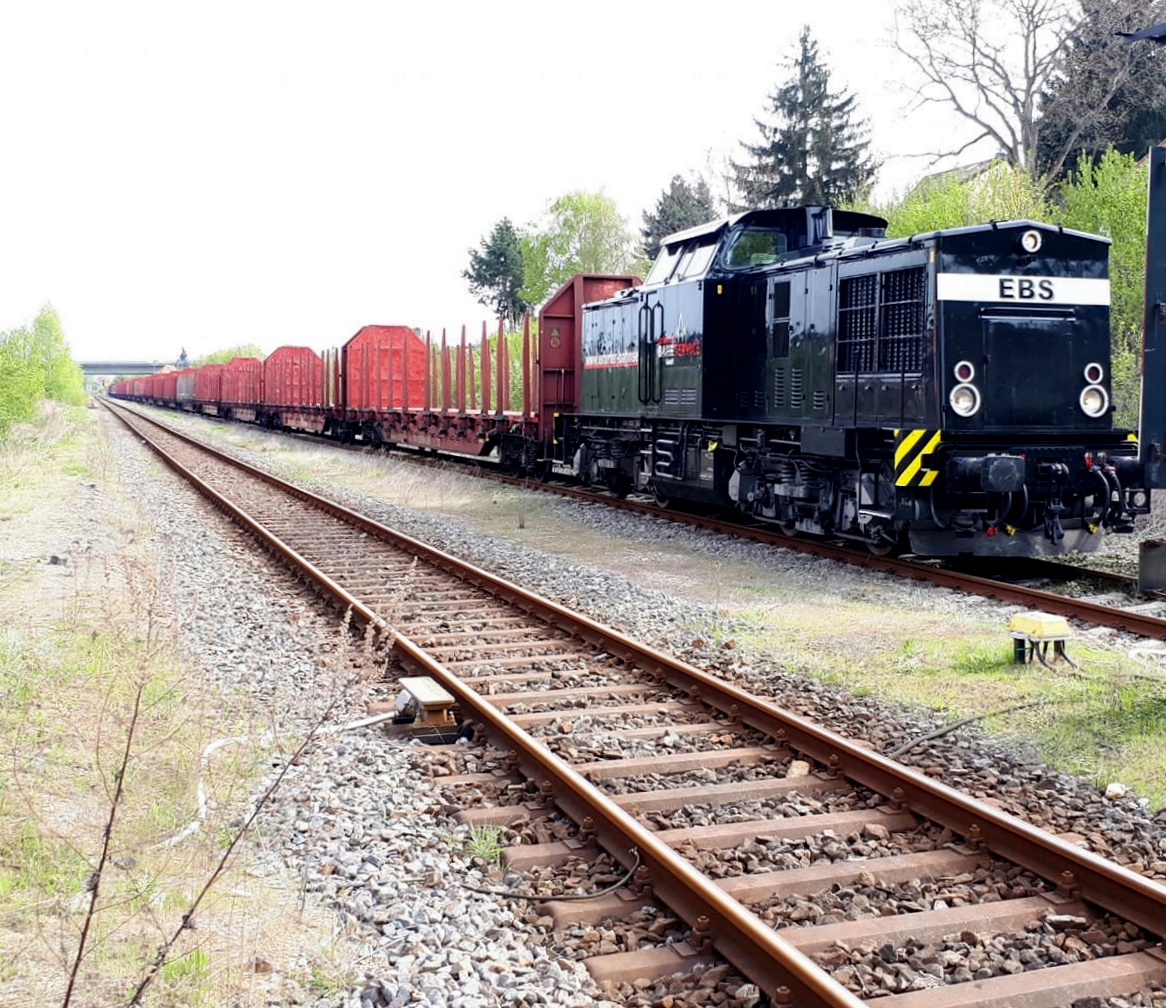 EBS 202 738-1 mit leeren Holztransportwagen Richtung Karsdorf, am 04.09.2018 in Freyburg Bbf. (Foto: Matthias Premper)