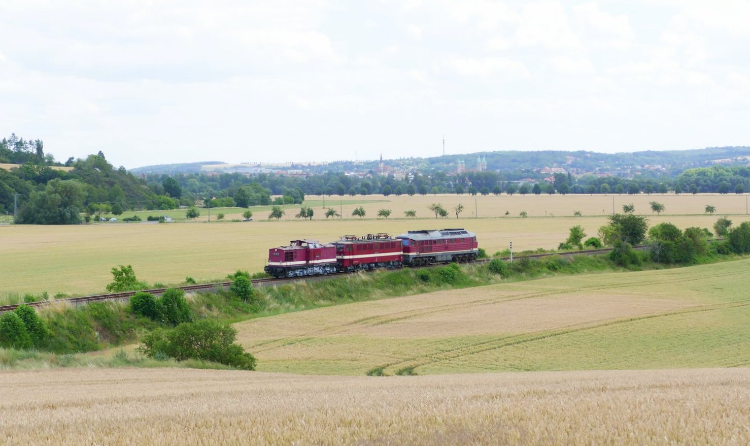 Am 06.07.2020 überführte die EBS 110 001 bei Kleinjena die 142 110 und die 132 334 ab Naumburg (S) Hbf nach Karsdorf. (Foto: Wolfgang Krolop)