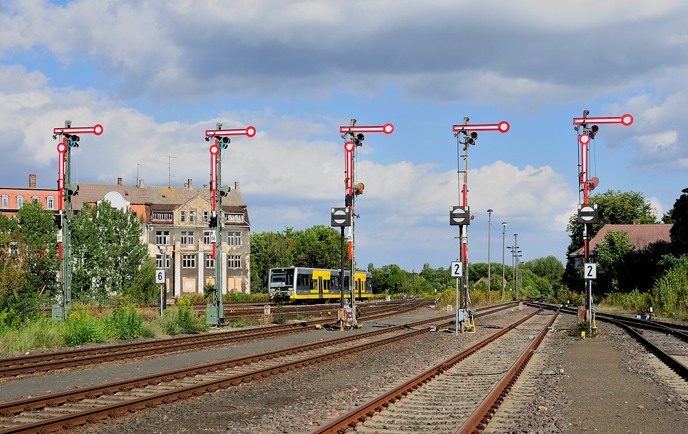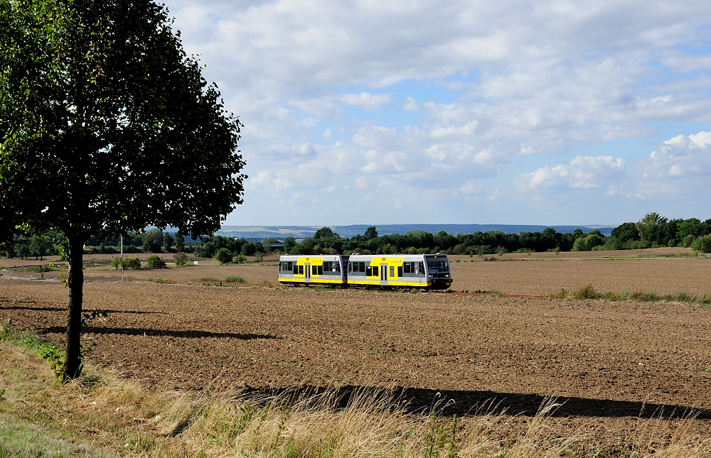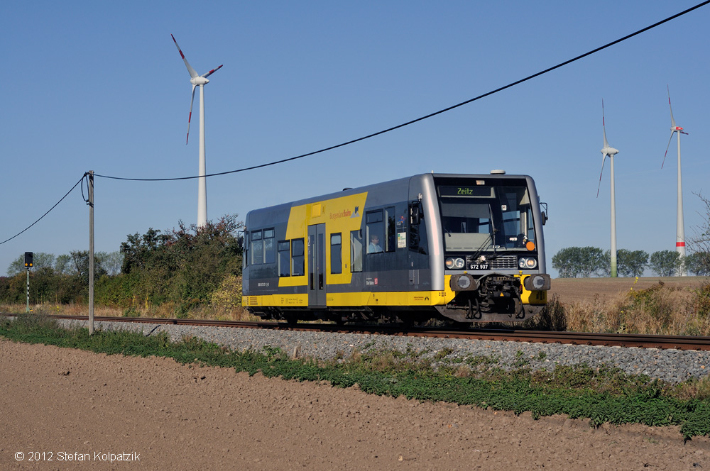 Jedes Jahr zum Winzerfest in Freyburg fährt die Burgenlandbahn im 2 Sundentakt auf der Hochbahn. Hier die 672 902 + 672 913 als RB 34946 von Zeitz nach Naumburg Ost, bei der Durchfahrt am 08.09.2012 in Mertendorf.