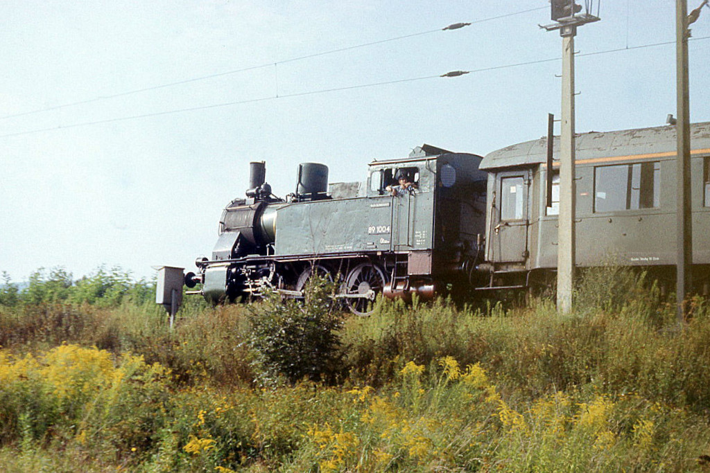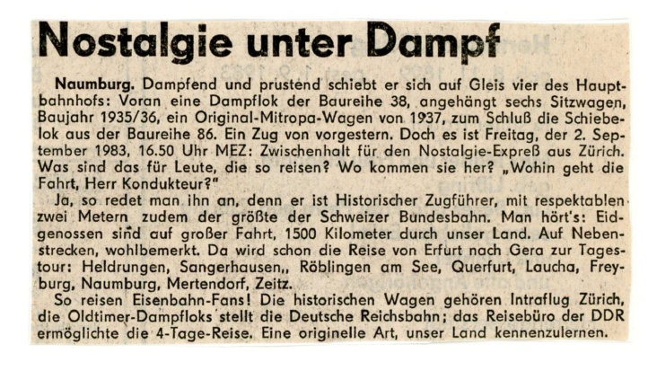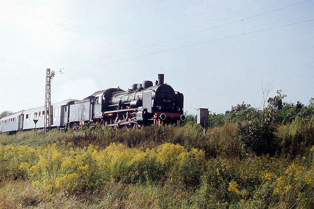 DR 38 1182 mit einem Intraflug-Sonderzug von Stuttgart nach Frankfurt (M), bei der Ausfahrt in Freyburg; 02.09.1983 (Foto: Eisenbahnstiftung Joachim Schmidt http://www.eisenbahnstiftung.de )