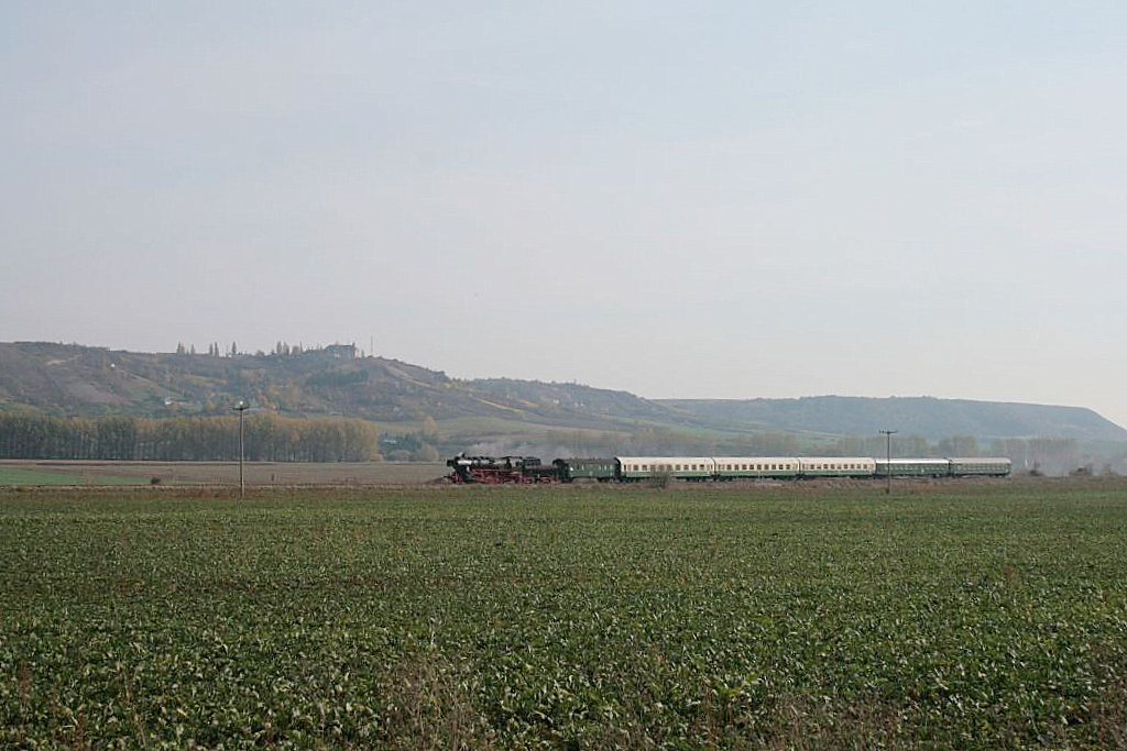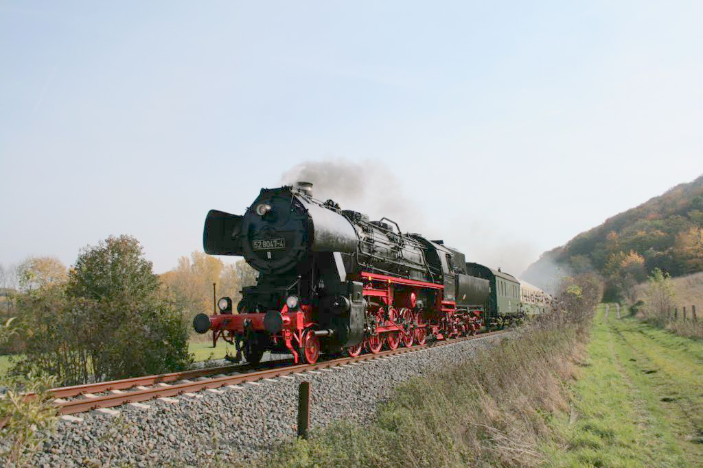 Die 52 8047-4 der IG Dampflok Nossen e.V. hat soeben Ausfahrtsfreigabe im Bf Laucha erhalten und setzt ihre Fahrt zum abstellen nach Karsdorf fort; 18.10.2008