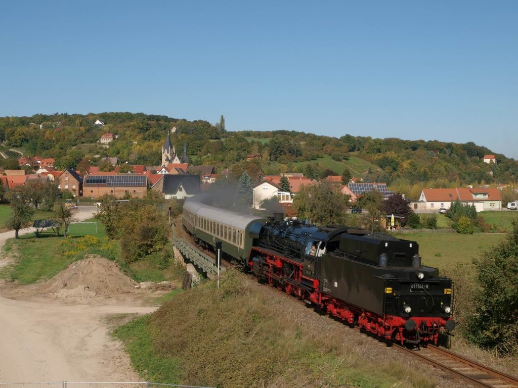 Bereits am 1. Oktoberwochenende war der "Rotkäppchen-Express II" aus Altenburg nach Freyburg unterwegs. Der sonst erst am Ende des Monats fahrende Sonderzug fuhr dieses Jahr durch den Streckensprerrung ab dem 08.10.2011 schon eher. Hier der Leerzug 74315 nach der Abstellung in Naumburg Hbf auf der Rückfahrt nach Freyburg, bei Kleinjena mit der IGE Werrabahn 41 1144-9; 01.10.2011 (Foto: Steffen Tautz)
