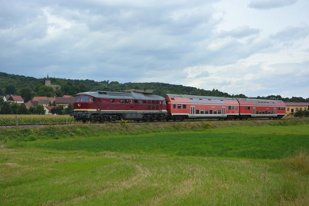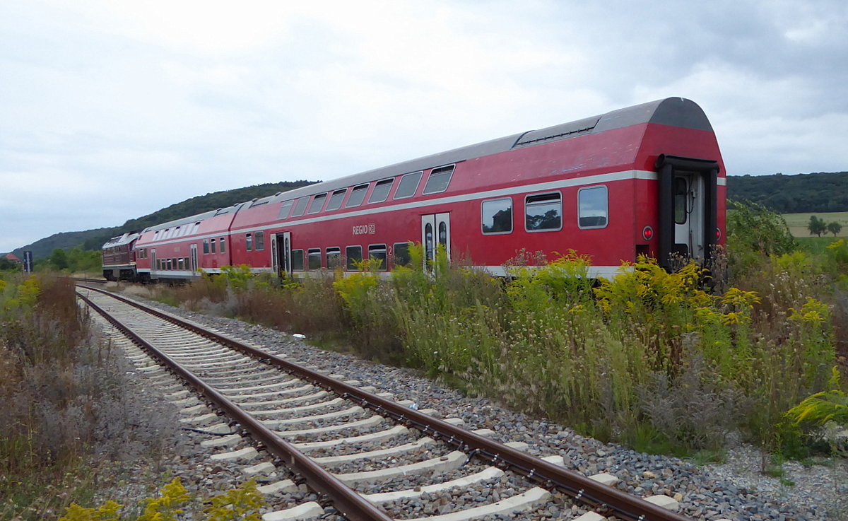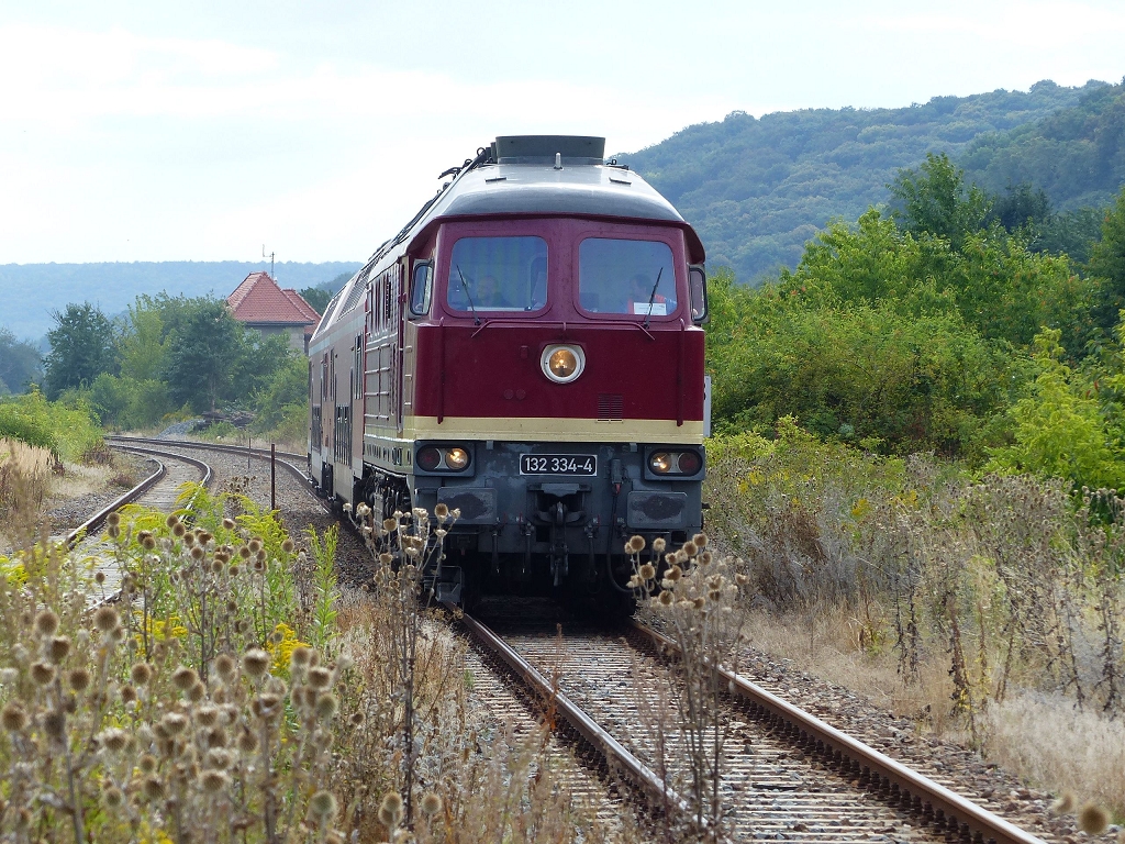 Am 20.08.2016 hat EBS 132 334-4 mit dem DPE 24871 (Naumburg Hbf - Karsdorf) den Hp Freyburg gerade verlassen und passiert gleich den BÜ in Höhe der Mühle Zeddenbach.