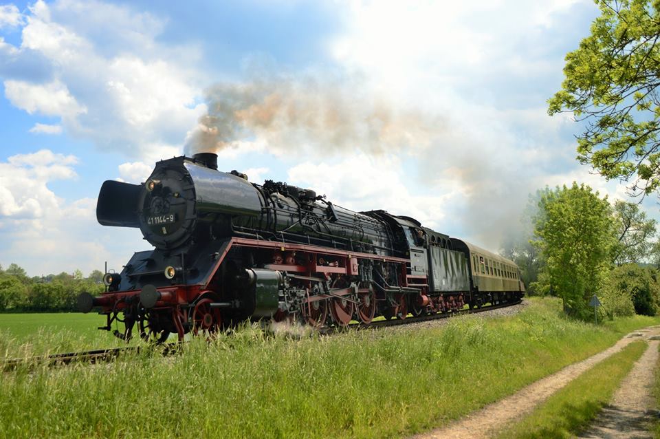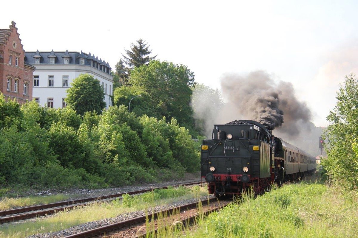 IGE Werrabahn-Eisenach 41 1144-9 mit dem leeren "Rotkäppchen-Express I" aus Freyburg, am 21.05.2017 in Karsdorf. Der Sonderzug kam zuvor aus Altenburg in die Weinstadt.