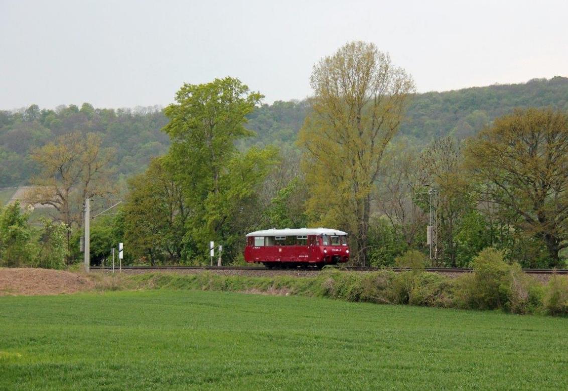EBS 772 345 als  Unstrut-Schrecke-Express  auf der Rückfahrt von Donndorf nach Naumburg Hbf, am 01.05.2017 bei Bad Kösen. (Foto: Wolfgang Krolop)