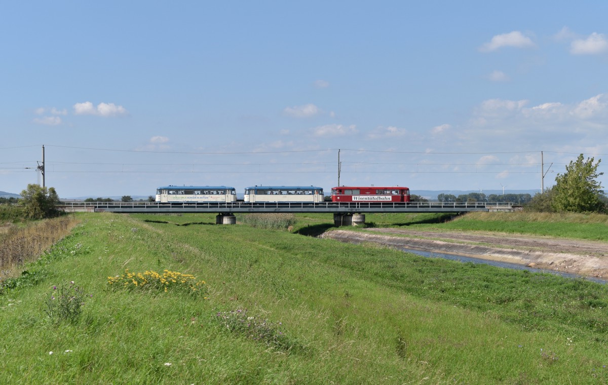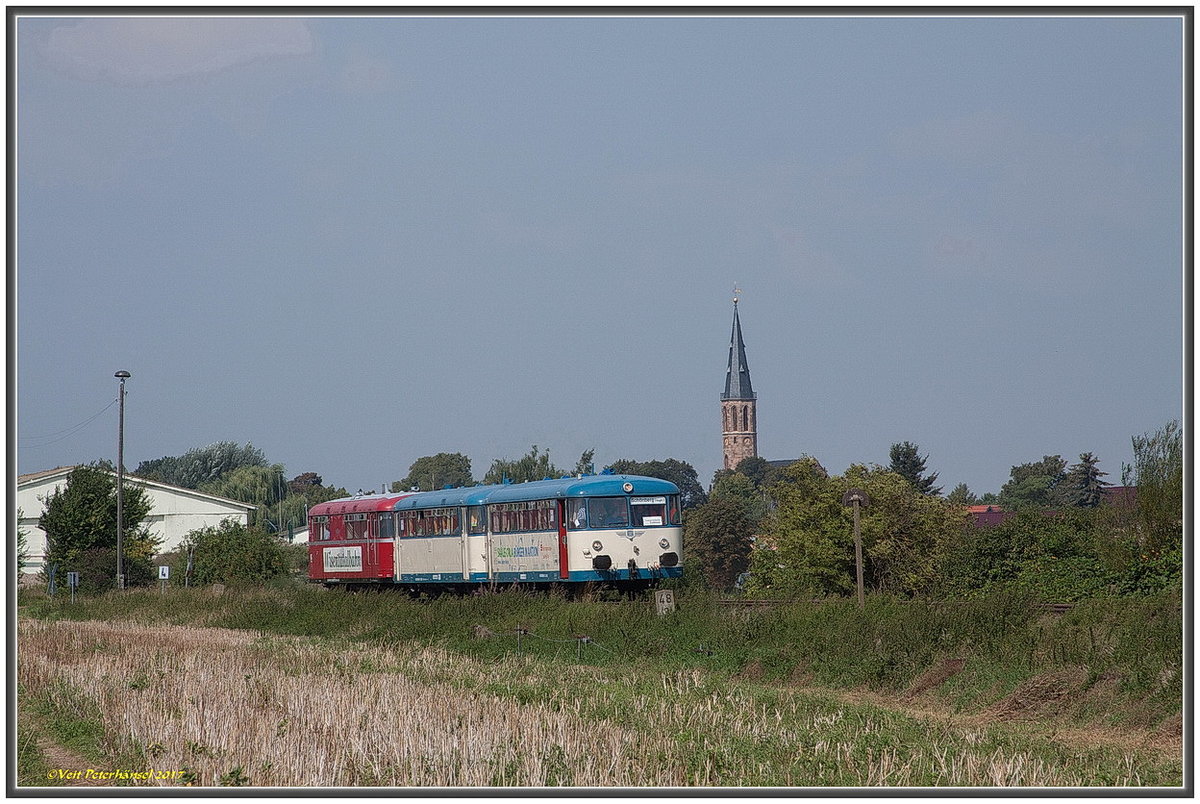 Wisentatalbahn/DRE 798 813 + 798 592 + 998 633 am 27.08.2017 als Sonderzug zum Unstrutbahnfest von Roßleben nach Artern, in Nausitz. (Foto: Veit Peterhänsel)