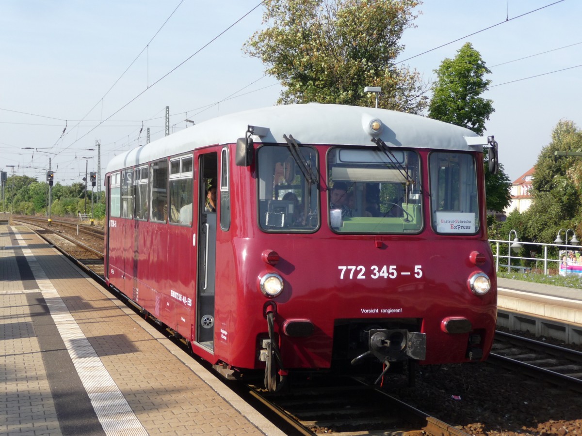 EBS 772 345-5 als "Unstrut-Schrecke-Express" DbZ 91358 von Erfurt Hbf nach Roßleben, am 24.08.2013 beim Halt in Sömmerda. (Foto: Christian Kirchner)
