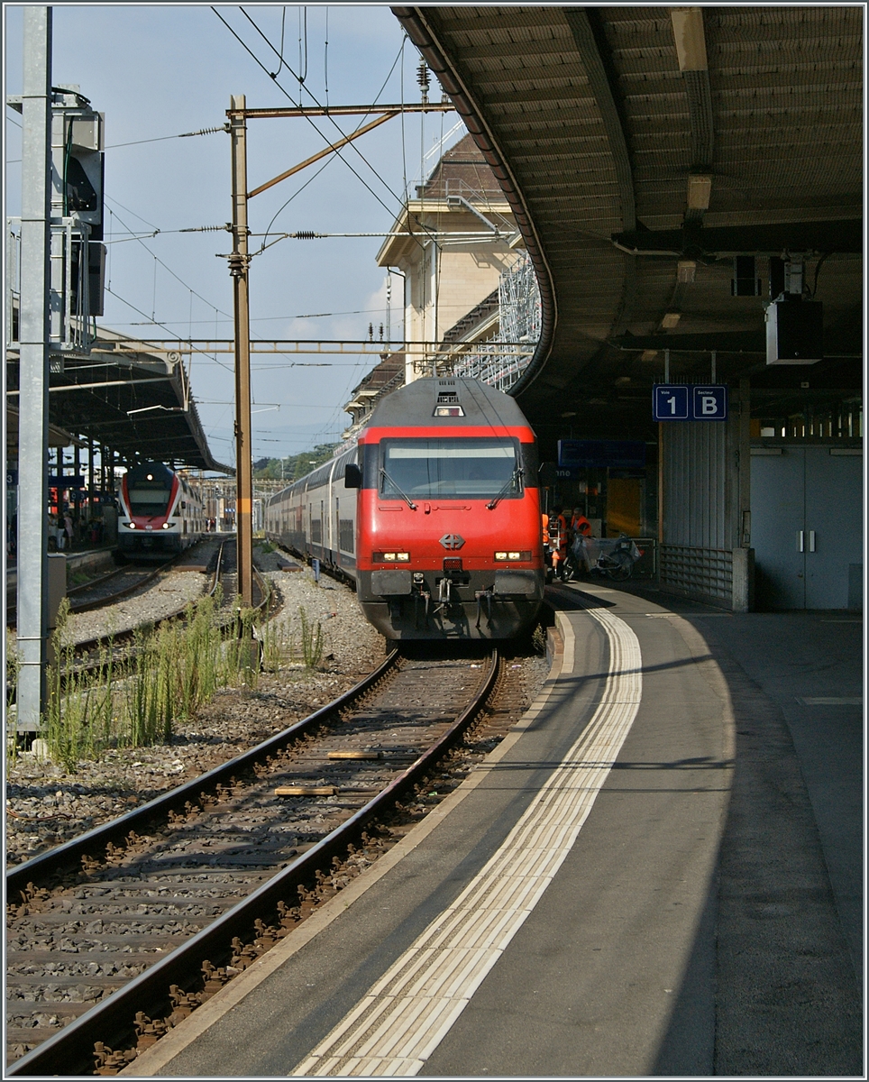 Die SBB Re 460 010  Swiss Tainable  ist in Montreux mit einem IR 90 von Genève Aéroport nach Brig unterwegs und dies wenig Minuten bevor die MOB Ge 4/4 8004  Swiss Tainable  Montreux erreicht hat, wobei beim zeitgleichem Erscheinen wohl kaum möglich gewesen wäre beide Loks auf ein Bild zu bekommen.