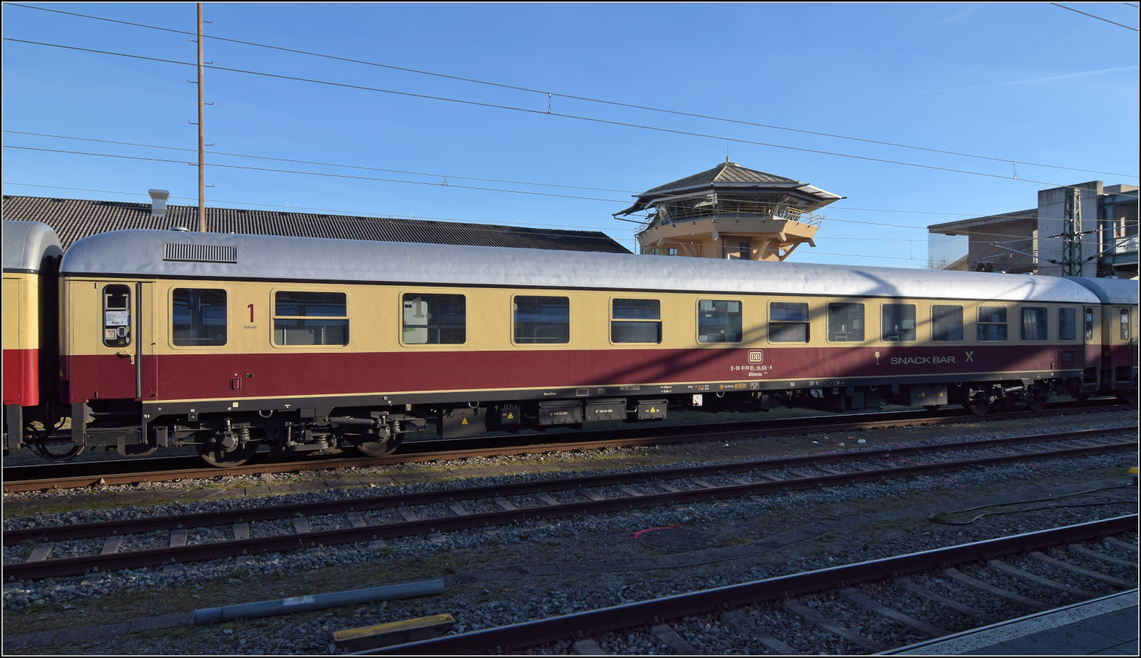 Wagen 5 ist ein ARmz 211.0, 61 80 85-95 538-2. Speiseraum ist angeschrieben. Diese Wagen sind mit 27,5 m besonders lang und wurden nach Entgleisungen im baustellenbeengten Stuttgart schnell abgestellt. Ursprünglich war der Wagen rot und blau wegen der drei Erstklassabteile lackiert, was ihm den Spitznamen Kakadu einbrachte. Wegen der verlängerten TEE-Abteile könnte man ihn eigentlich den vm-Wagen zuordnen. November 2025.