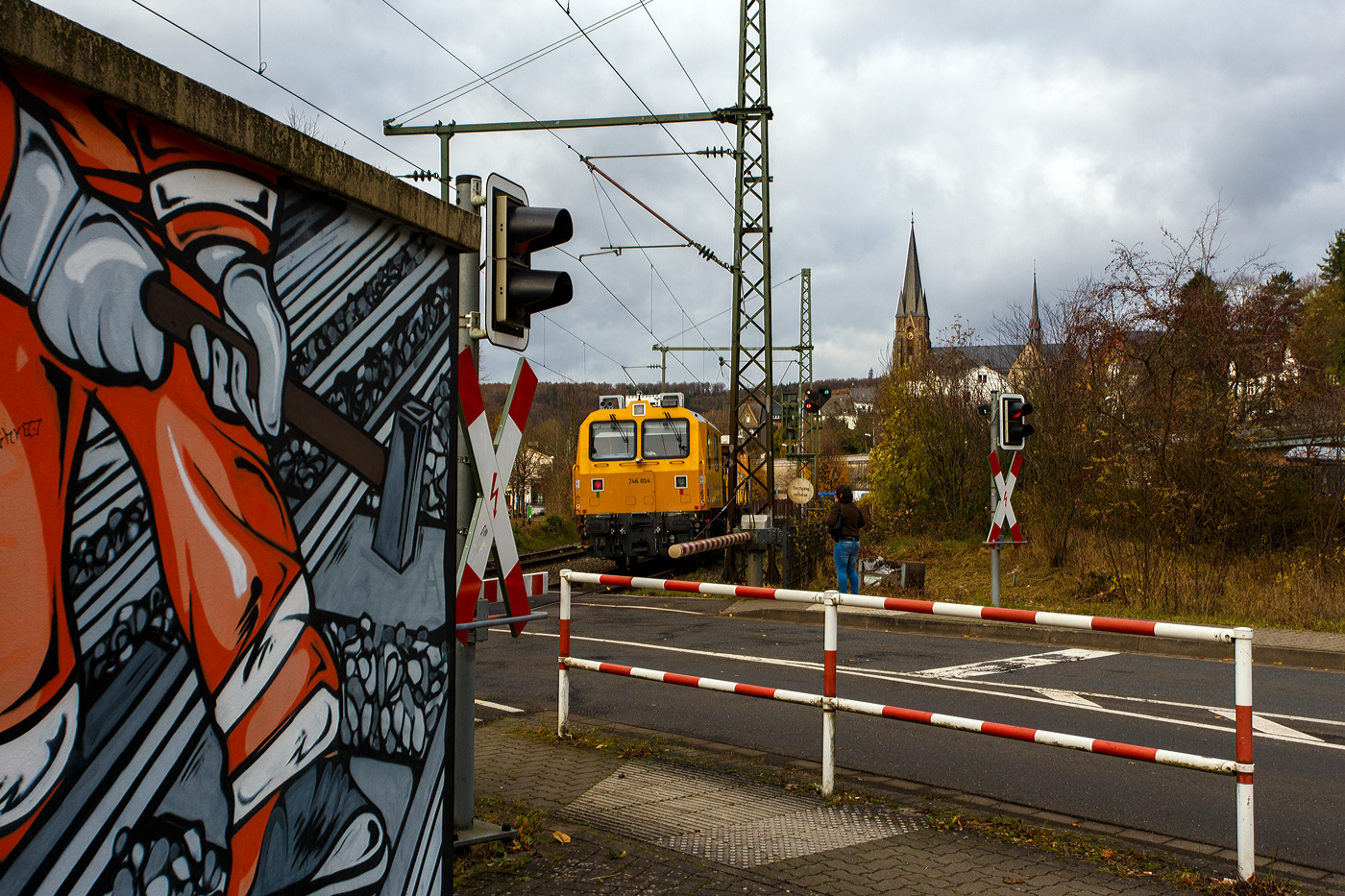 Das Gleisarbeitsfahrzeug „Hummel“ 746 014 (99 80 9110 014-4 D-DB), ein neues Plasser & Theurer GAF (MISS-Plattform) der DB Netz AG (Netz Instandhaltung) ist am 18.01.2022 im Rbf Betzdorf (Sieg). Es kam wohl über die Hellertalbahn aus Richtung Herdorf und bevor es über die Siegstrecke in Richtung Siegen weiterfahren kann, muss es erst den planmäßigen Personenverkehr abwarten.