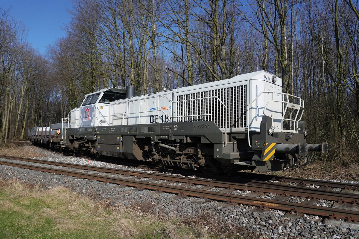 Die an die TX Logistik AG vermietete 193 921 (91 80 6193 921-4 D-NRAIL) der Northrail GmbH fährt am 06 Mai 2025 mit einem KLV-Zug (Taschenwagenzug) durch den Bahnhof Kirchen/Sieg in Richtung Köln. Rechts auf Gleis 2 hält der HLB VT 504 als RB 93 "Rothaarbahn" nach Erndtebrück.