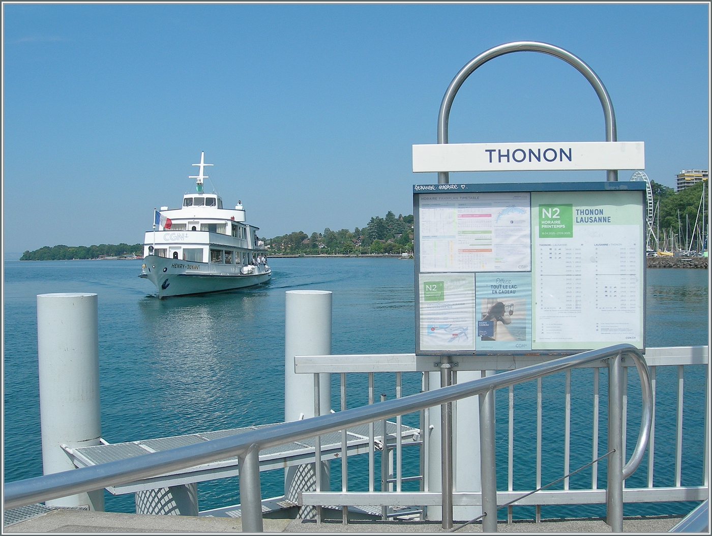 Während eine SBB Re 460 ihren IR90 bei Villeneuve in Richtung Genève schiebt, ist beim Château de Chillon der CGN Raddampfer "Italie" angekommen.