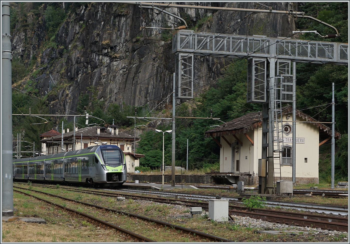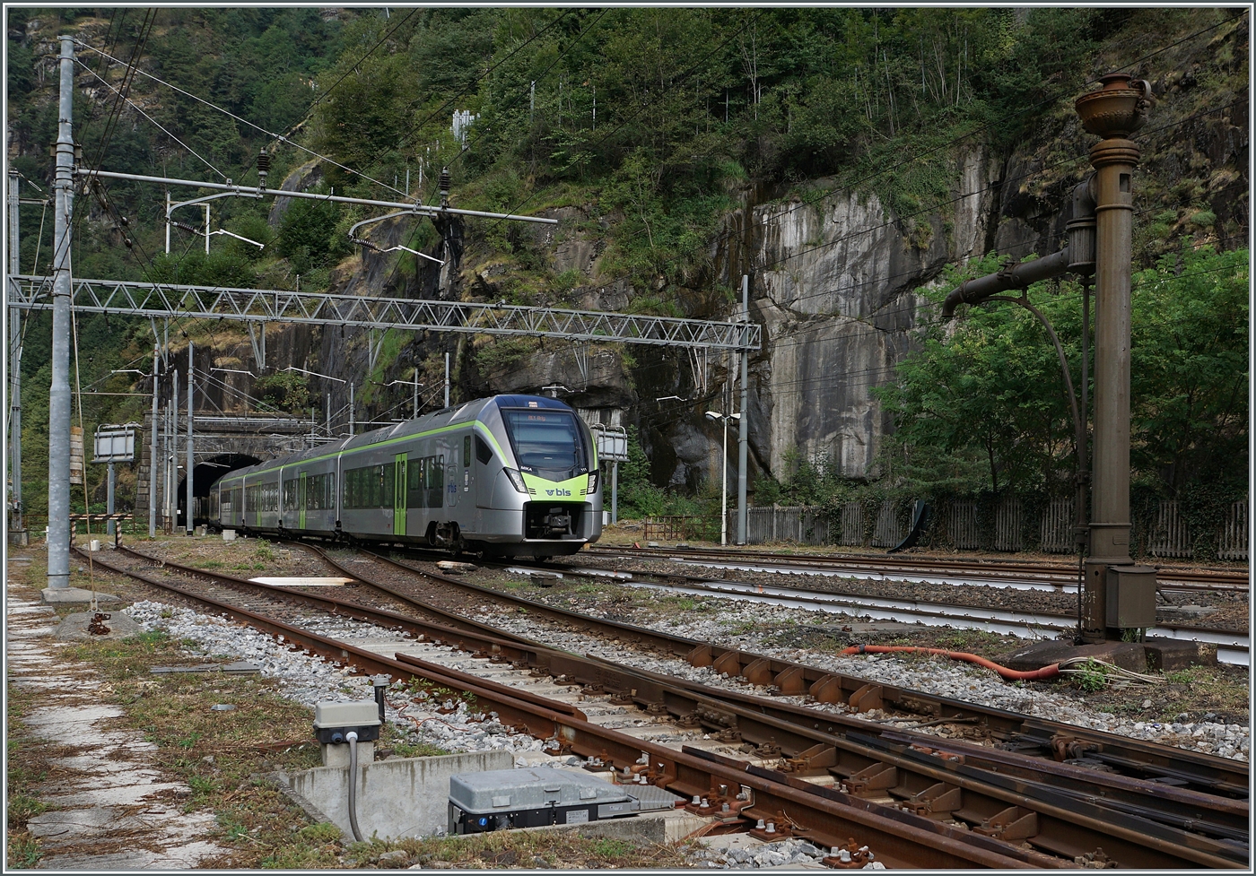 Ein BLS RABe 528 MIKA verlässt den Bahnhof von Iselle in Richtung Brig (SEV Iselle-Domo).