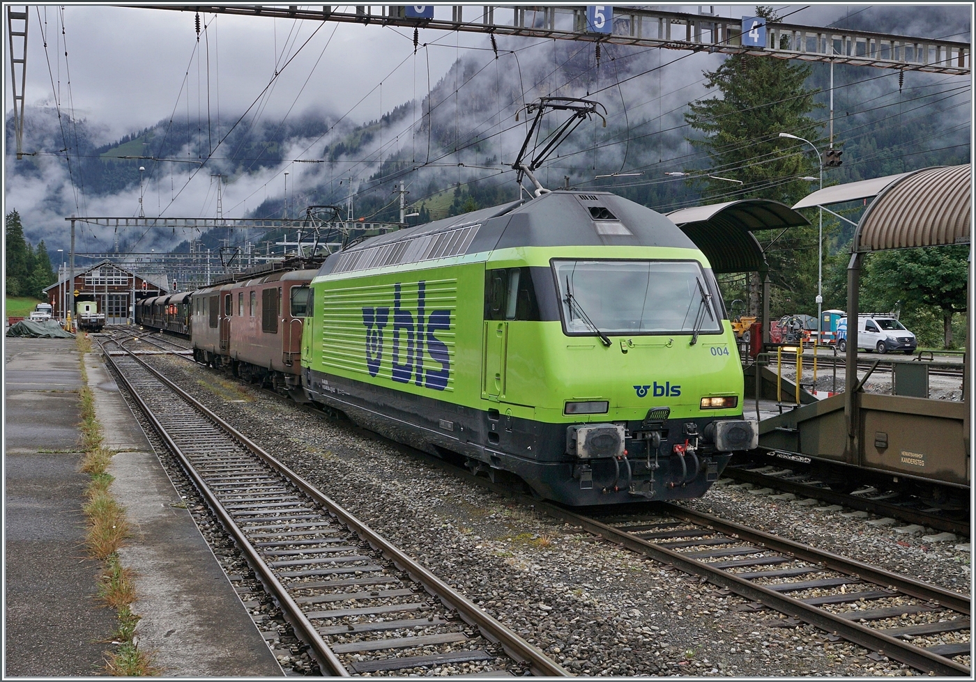 In Kandersteg stehen hinter der BLS Re 465 004 die beiden BLS Re 4/4 192 und 184 aufgebügelt und warten auf einen nächsten Einsatz. 12. Sept. 2024