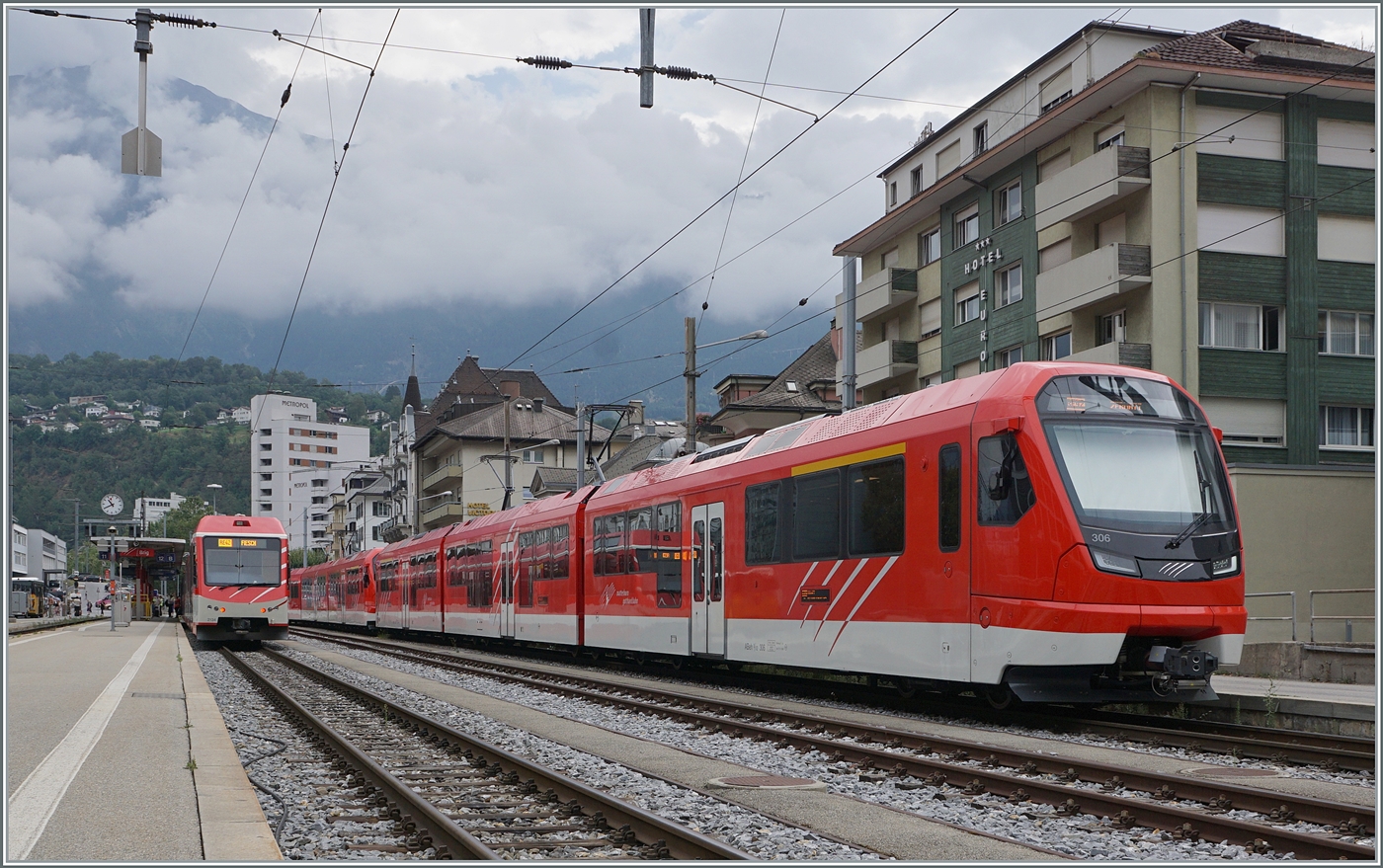 Während die MGB HG 4/4 II N° 4 mit ihrem Regio von Zermatt in Visp für die Rückfahrt nach Zermatt wendet, erreicht eine SBB Re 460 mit ihrem IR 61 von Brig nach Basel den Bahnhof von Visp.