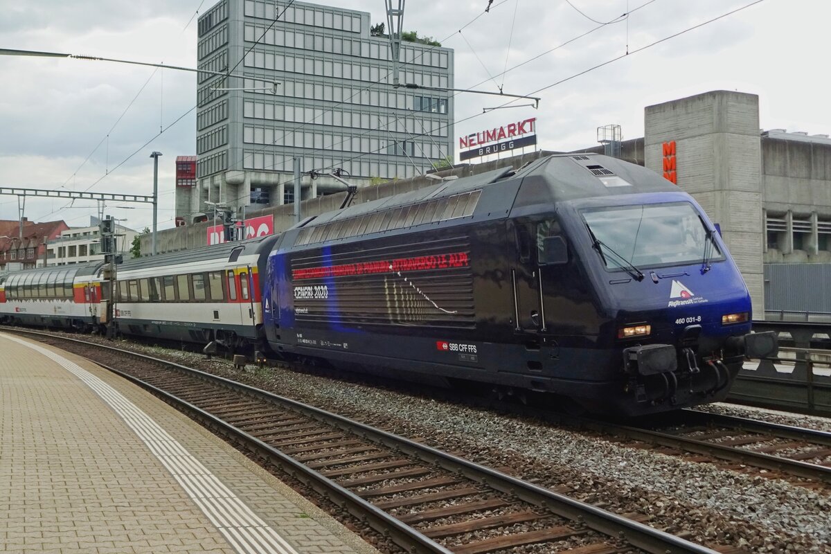Geführt von einer SBB Re 460 erreicht der, aus 10 Dosto-Wagen bestehende IC 8 nach Brig, am 11.07.2022 den Bahnhof Spiez.