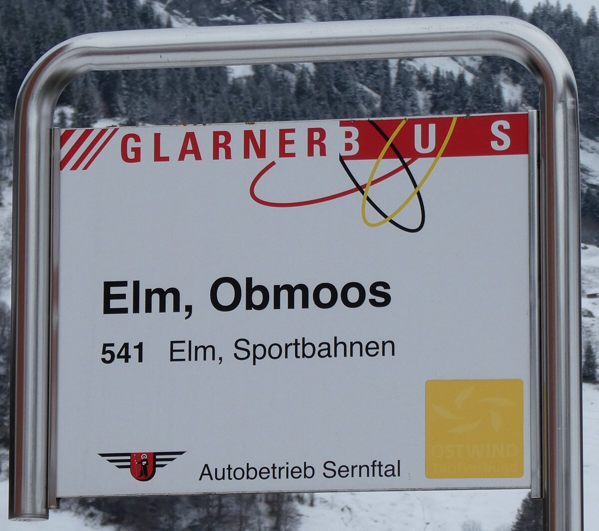 (284'450) - GLARNER BUS/Autobetrieb Sernftal-Haltestellenschild - Elm, Obmoos - am 30. Januar 2026