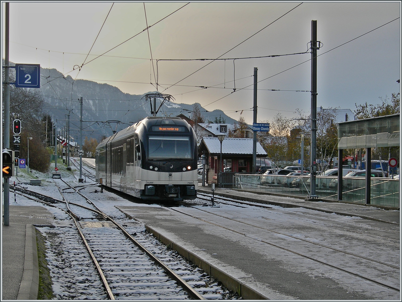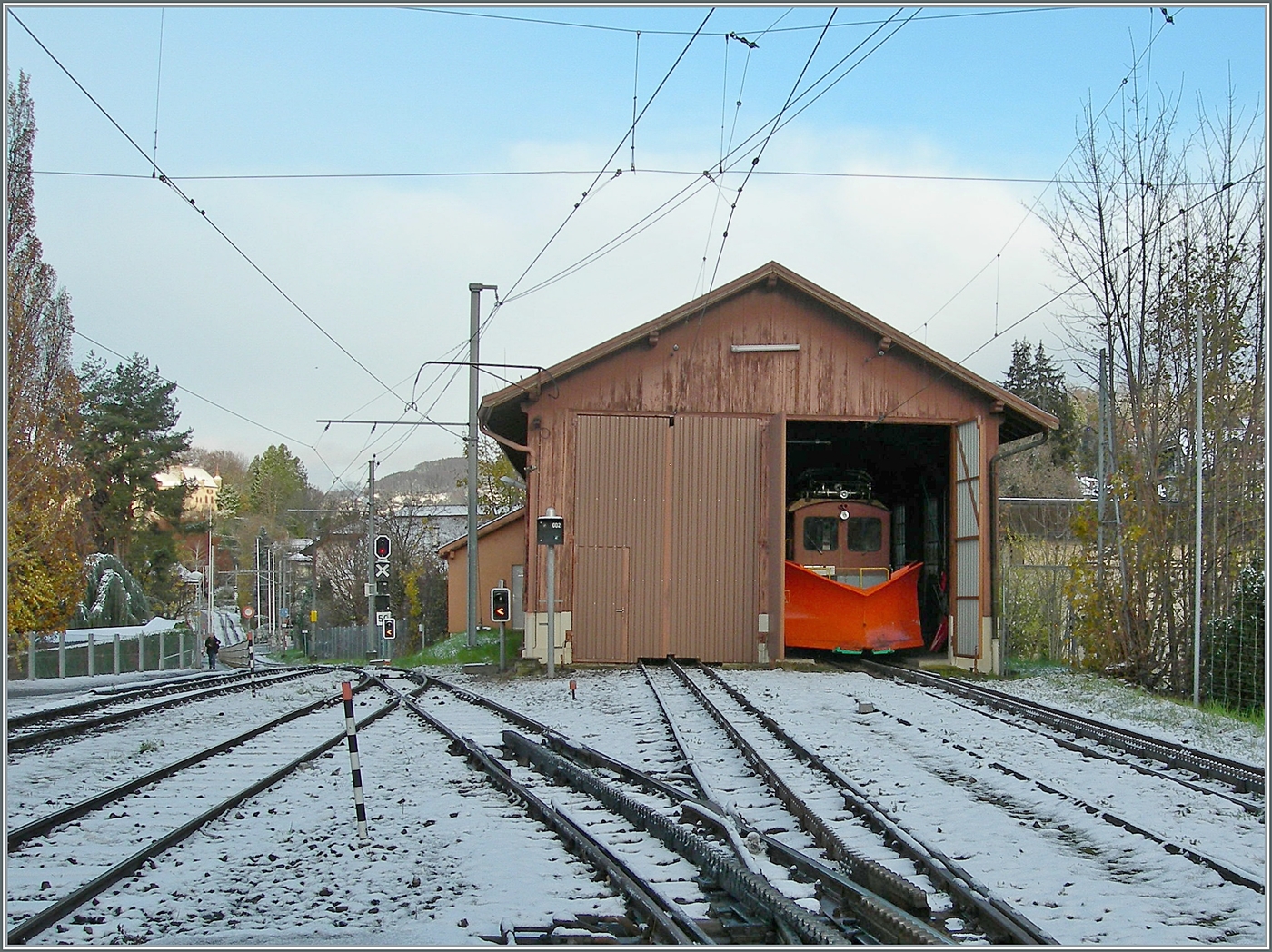 Während links im Bild ein SBB RABe 523 als Regionalzug Vevey in Richtung Aigle verlässt, wartet im Hintergrund ein CEV MVR ABeh 2/6 auf seinen nächsten Einsatz.