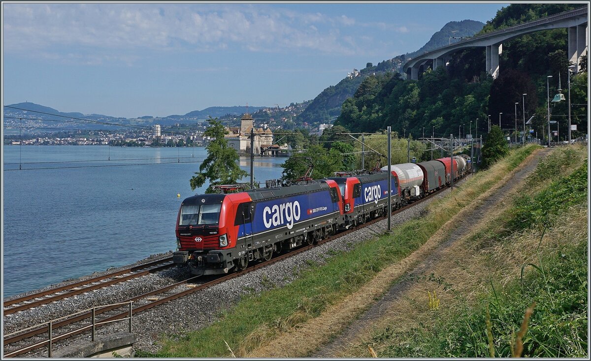 Die SBB Re 4/4 II 11243 (Re 420 243-8 ) "Smile" ist mit einem Güterzug bei Villeneuve auf dem Weg in Richtung St-Maurice.