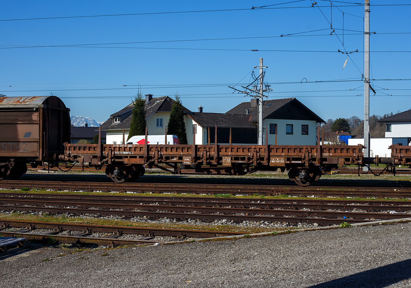 Zweiachsiger Flachwagen mit Seiten- und Stirnwandklappen, Seiten- und Stirnwandrungen, sowie Befestigungseinrichtungen für Container, 21 85 3329 041-5 CH-SBBI der Gattung Kgs (Xns) ein Kgs-Güterwagen/Xns- Dienstwagen Kgs der SBB Infrastruktur (vermutl. für Fahrleitungsdienst) abgestellt am 07 September 2021 beim SBB Depot in Brig, aufgenommen aus einem MGB-Zug heraus.
