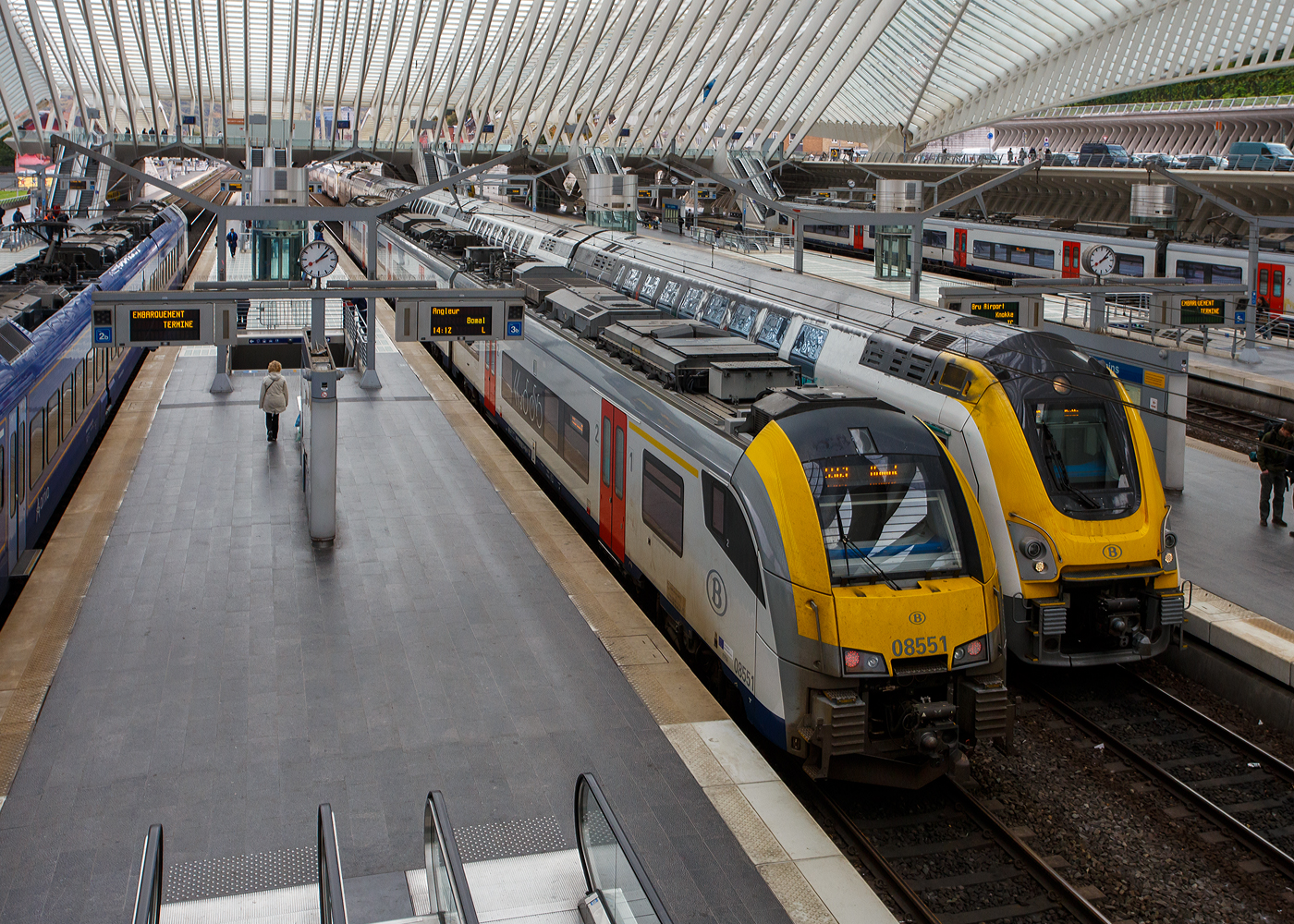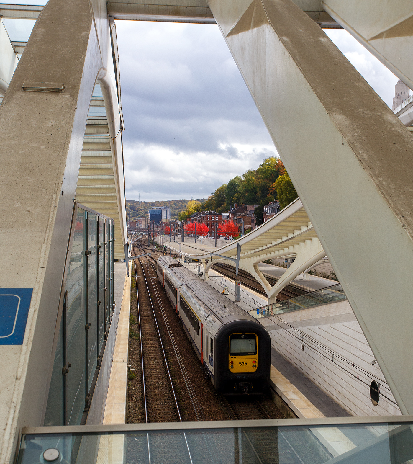 Der Oberleitungsmesstriebwagen (Autorail de Mesure Caténaire) EM 201 mit der UIC-Nummer 99 88 9165 201-3 B-INFBL, ein Geismar Eye Dragon VMB2214-IC der belgischen INFRABELverlässt am 21 Oktober 2025 den Bahnhof Lüttich-Guillemins (Gare de Liège-Guillemins) hinauf in Richtung Ans bzw. Brüssel.