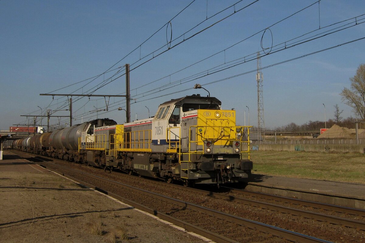 Nach der Ausfahrt vom Bahnhof Lüttch-Guillemins (Gare de Liège-Guillemins) in Richtung Brüssel, der Bahnstrecke Brüssel – Lüttich (Linie 36) folgt bald die 30 ‰ steile Rampe Haut Pré, darum muss bei langen schweren Zügen eine Lok Schubhilfe leisten. Früher war oben am Haut Pré die Bergstation einer Kabelzuganlage. Hier kommt die SNCB/NMBS HLD 7764 "Toledo" am 23.11.2013 nach getaner Arbeit (Schubhilfe) retour.