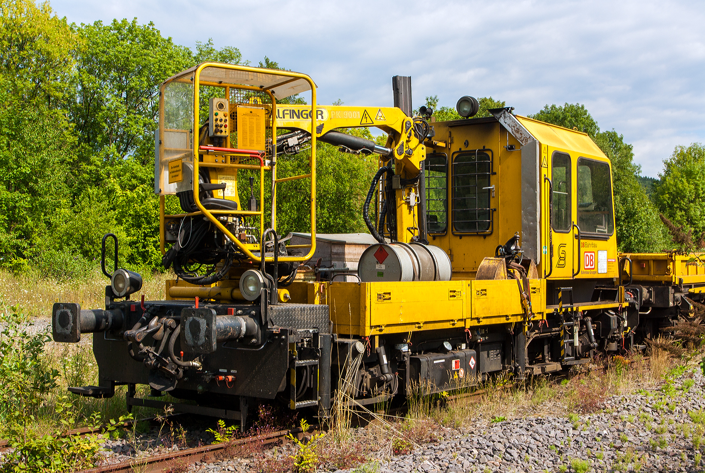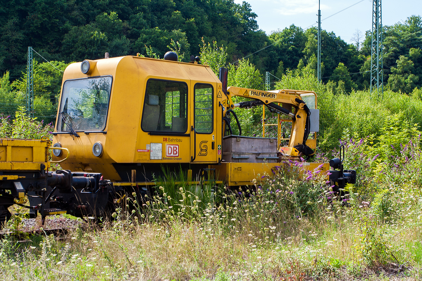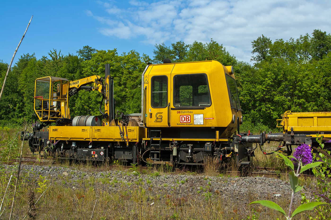 Der Gleiskraftwagen GKW 315 / D-DB 99 80 9420 008-1, ex Schweres Nebenfahrzeug Nr. 97 17 56 028 17-3, ein Gleisarbeitsfahrzeug Robel BAMOWAG 54.22 der DB Bahnbau Gruppe GmbH, rauscht am 27.01.2023, mit der Schienenladezug SLE 993 / D-DB 99 80 9351 002-7 (Rutschenwagen 1 mit Schienenmanipulator und Rutschenwagen 2) der DB Bahnbau Gruppe, einer Schienenzugladeeinrichtung vom Typ Robel SILAD 40.61- RW1, durch Wilnsdorf-Rudersdorf in Richtung Siegen.