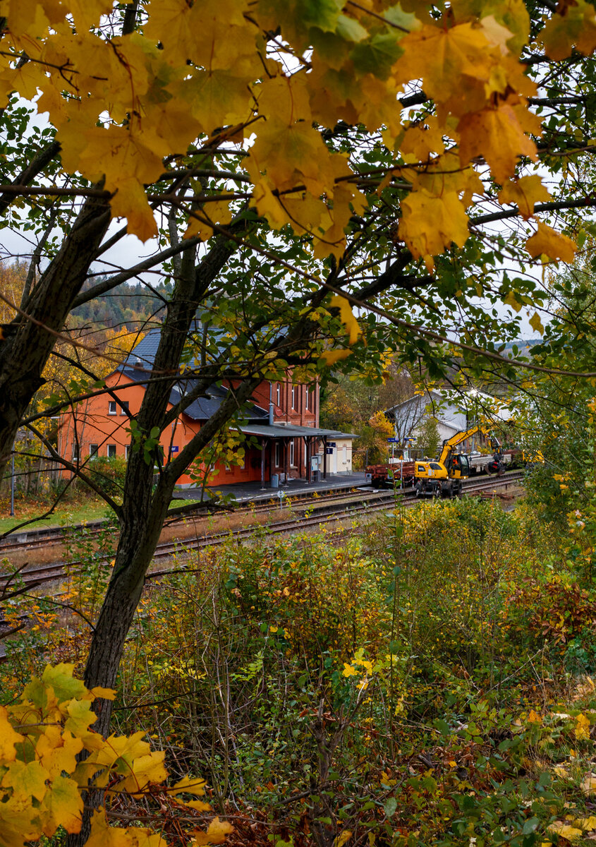 Rückansicht von dem Caterpillar CAT M323F Zweiwegebagger mit hydrostatischem Schienenradantrieb (Serien-Nr. RH600 160), Kleinwagen Nr. D-ZBM 99 80 9902 510-3 der ZEPPELIN Baumaschinen GmbH (Garching) abgestellt am 01.04.2023 beim Hp Grünebach Ort (an der Hellertalbahn).