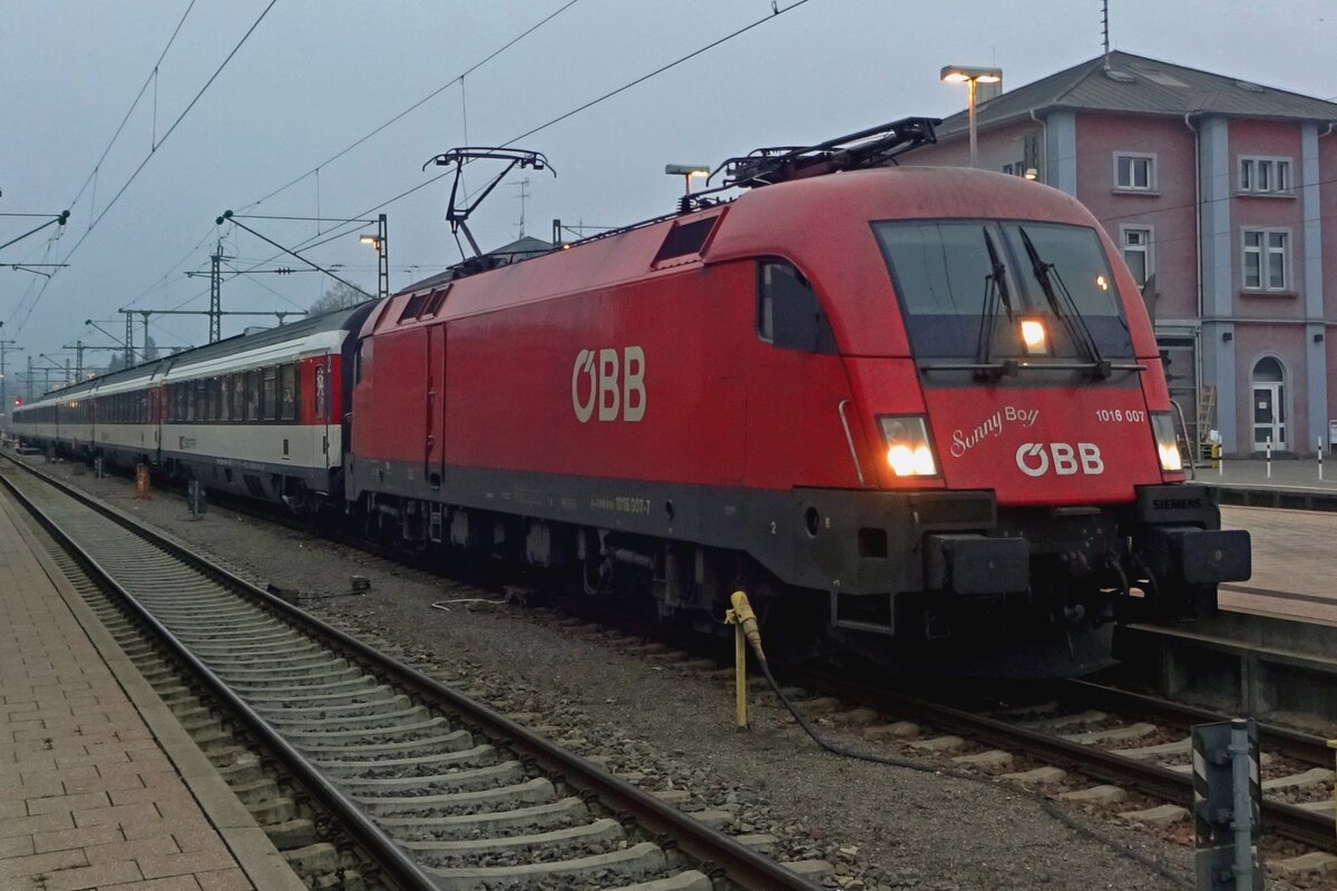 Diesellokklassiker: Zwei DB 218 Dieselloks verlassen mit ihre EC von Zürich nach München den Bahnhof von Lindau.