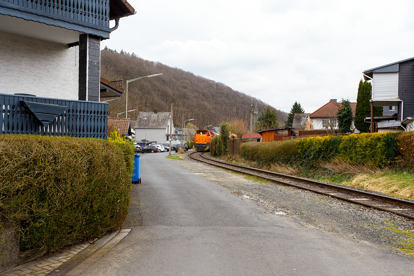Nun drückt die 271 022-6 „Charlotte“ (92 80 1271 022-6 D-KAF) eine Vossloh/MaK G 1000 BB der KAF Falkenhahn Bau AG. ex MRCE bzw. ex HGK DH 49, am 26 August 2025 den mit Aushub beladenen Niederbordwagen-Zug (zweiachsiger Flachwagen NS Gattung Klmos 702 der Vermietungsfirma Railpro), von der Baustelle im Bf Scheuerfeld/Sieg ca. 3 km nach Betzdorf/Sieg. Beim Rbf Betzdorf befindet sich die Umladestation, hier wird der Aushub von Baggern abgeladen und zwischengelagert.